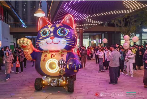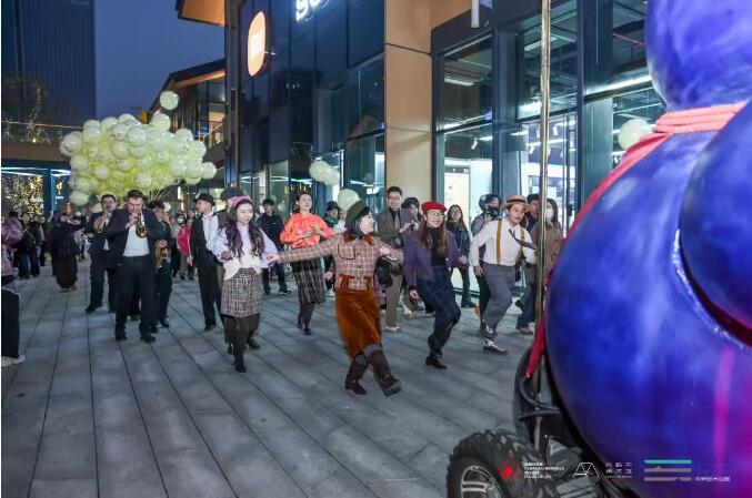 随着亮灯仪式结束,“烟火巡游” 活动的热情迅速蔓延整个公园:西洋管乐大队奏响经典爵士旋律,复古装扮的摇摆舞者邀约市民共舞;大型互动装置招财猫化身移动的“许愿池”,沿商业街中轴线开展夜巡合照。无数温暖的橙黄色光点点缀在街巷之间,构成一幅幅动人的冬日夜景,艺术与城市烟火在此刻共生共融