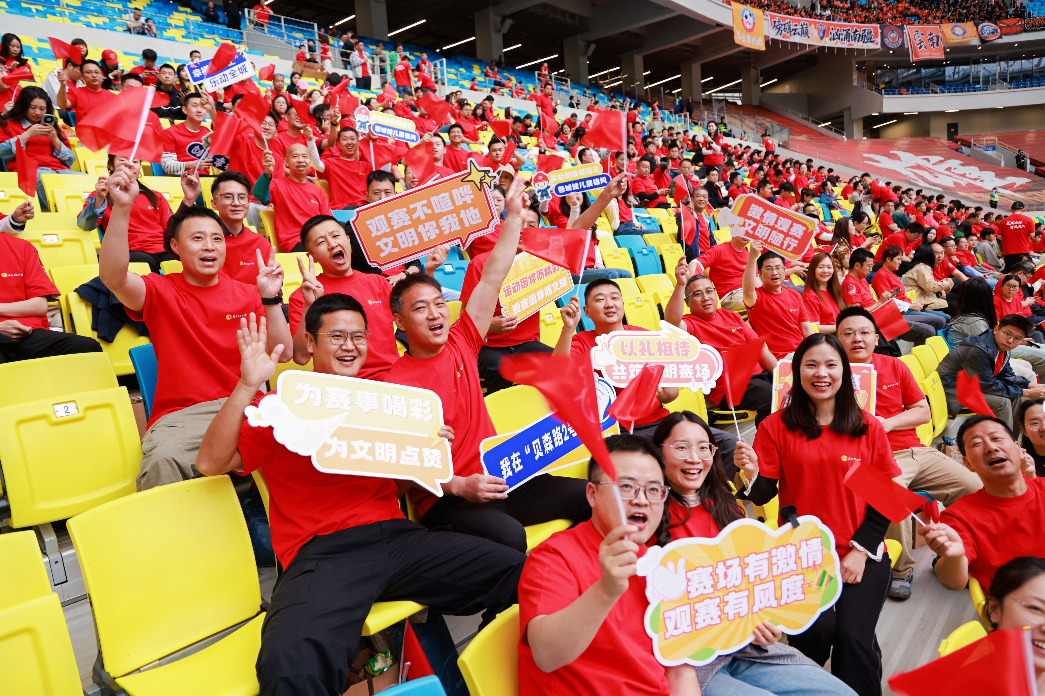 当主持人介绍这支特殊观赛团时,全场球迷纷纷起立鼓掌,向城市发展的默默奉献者致以诚挚敬意,他们和为这座城拼搏的球员一样,躬身践行奋进向上的城市精神。看台上,“劳动最光荣”“奋斗最美丽”的标语与文明观赛提示牌交错呈现,“润物细无声”地传递文明理念。整场比赛,公益看台的观众们热情助威、有节有序,展现出成都劳动者良好的精神风貌与品质。文明风采与体育激情相互交融,让这座“雪山下的公园城市”更添温度与厚度。