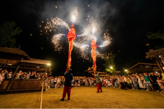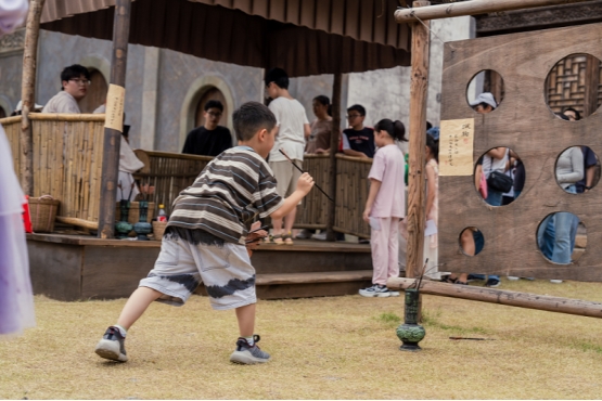 不仅可逛可做,更可穿可感。亲子家庭还可亲历换装、关扑、投壶、捶丸、蹴鞠、听书等宋代娱乐活动,暮色四合后观赏非遗火流星、传统杂技演出。景区以“不夜”延展体验的深度,以“宋潮”强化文化的厚度,更以“穿越”回应亲子家庭渴望暂停、渴望不一样的身份体验的情感需求,为青少年与家长打造出可触摸、可体验、可安放身心的文化疗愈场。