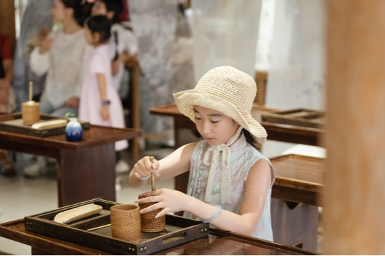 从眼观秋色,到手作秋意,濮院还将季节的流动转化为“可带走”的体验。景区聚焦季节美学与手作疗愈,推出十余项手作体验:毛线编织、银杏手作、中药香囊、篆刻书法、篆香串珠等等,让孩子在深度体验中充分感知,真正实现“寓教于乐”。