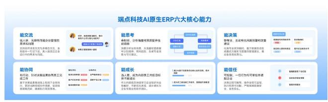 端点科技AI原生ERP将AI全面融入软件体系,具备六大核心能力,推动企业从传统管理向智能化、协同化转型,确保管理动作的精准与高效。